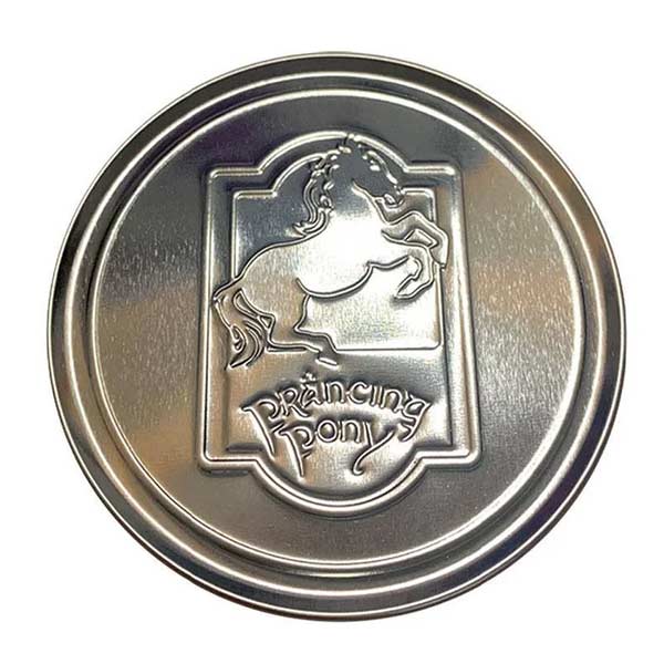 Súprava obsahuje 4 ks okrúhlych kovových podtáckov s dvojicou rôznych vzorov z Pána prsteňov - s vývesnými štítmi hostincov U Skákavého poníka a U Zeleného draka.