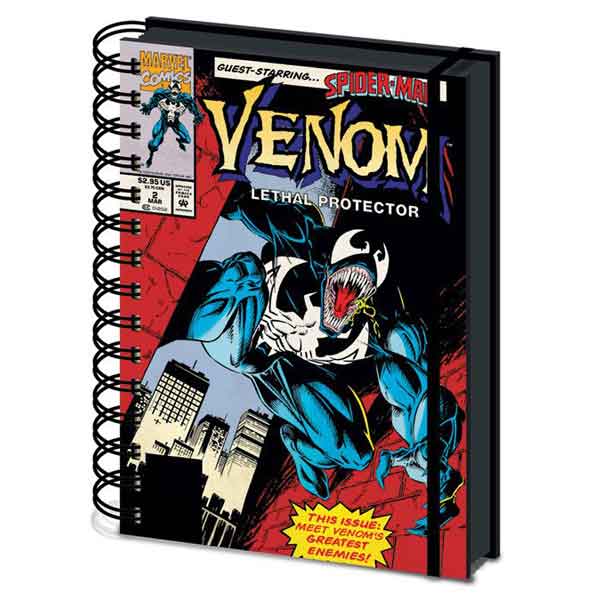 Licencovaný zápisník s motívom Venom. Linajkový zápisník so záložkou a úchytkou na pero či ceruzku je zabezpečený gumičkou proti voľnému otváraniu s okrasným kovovým logom.